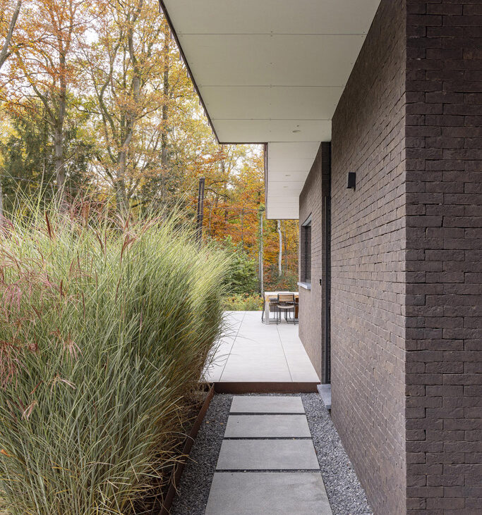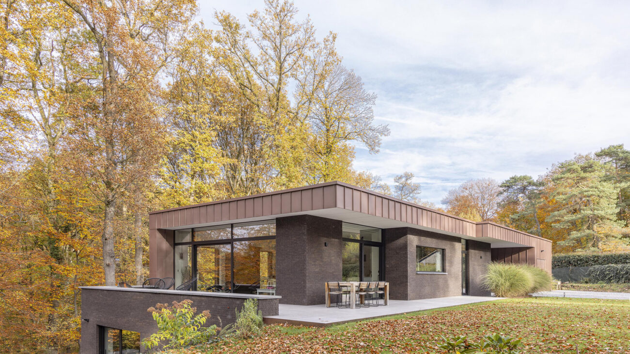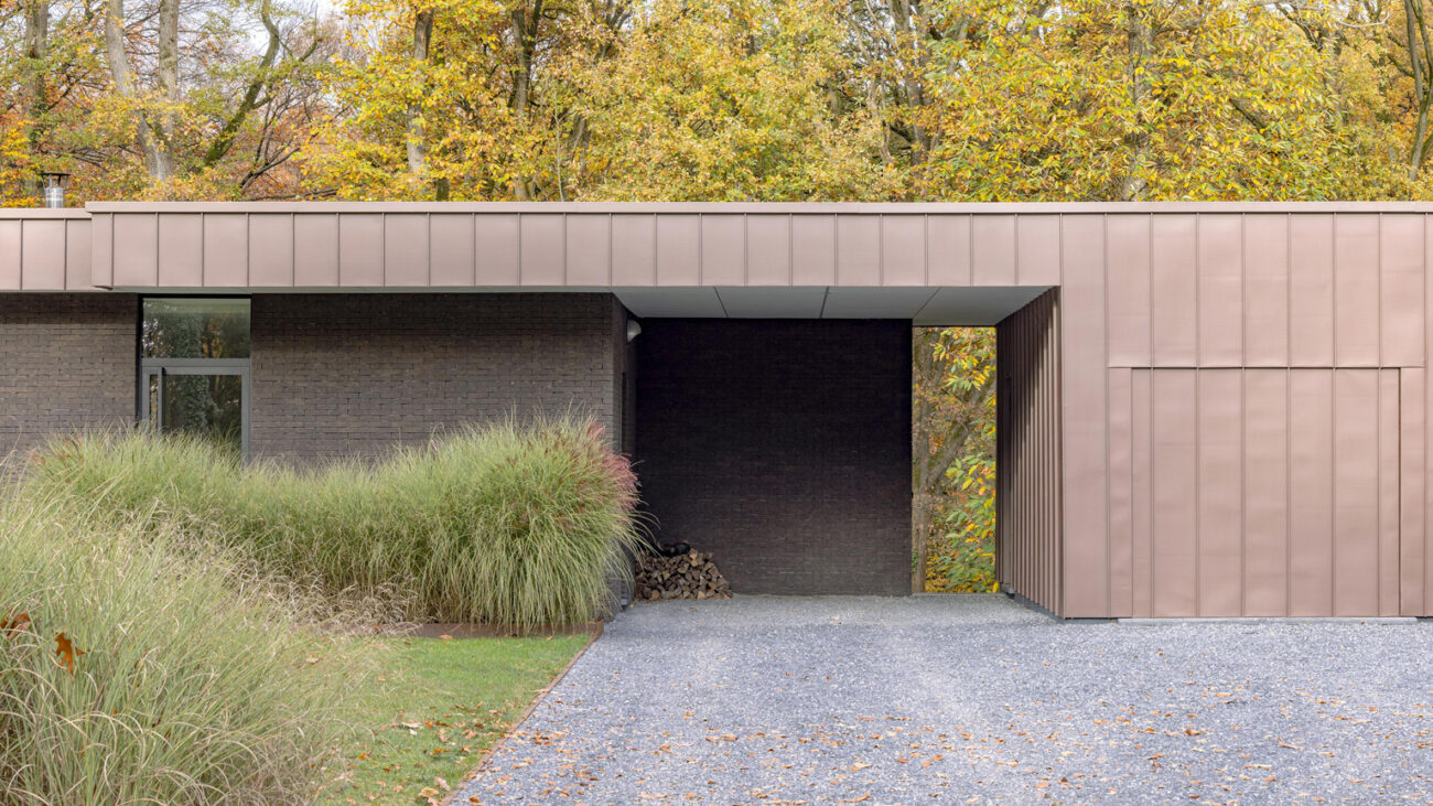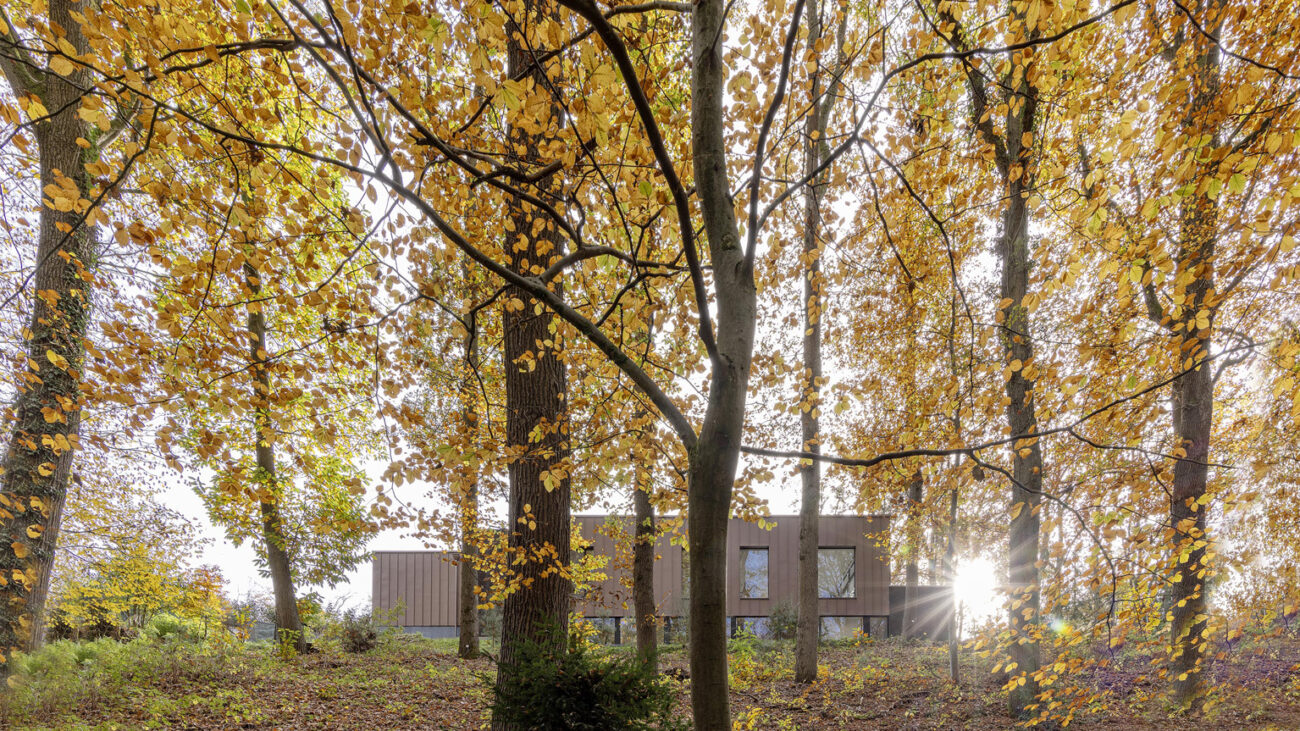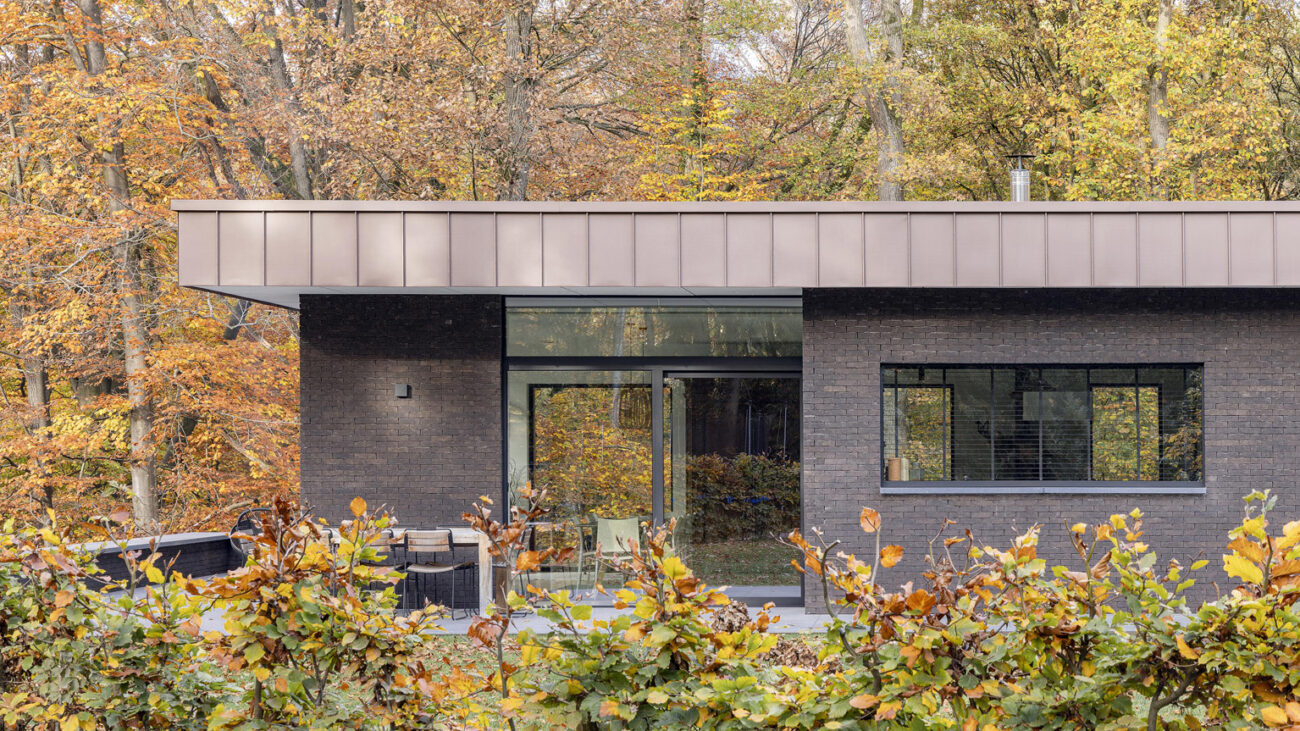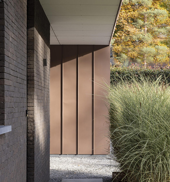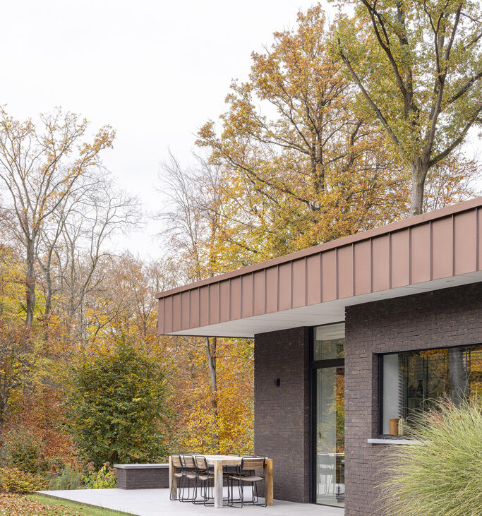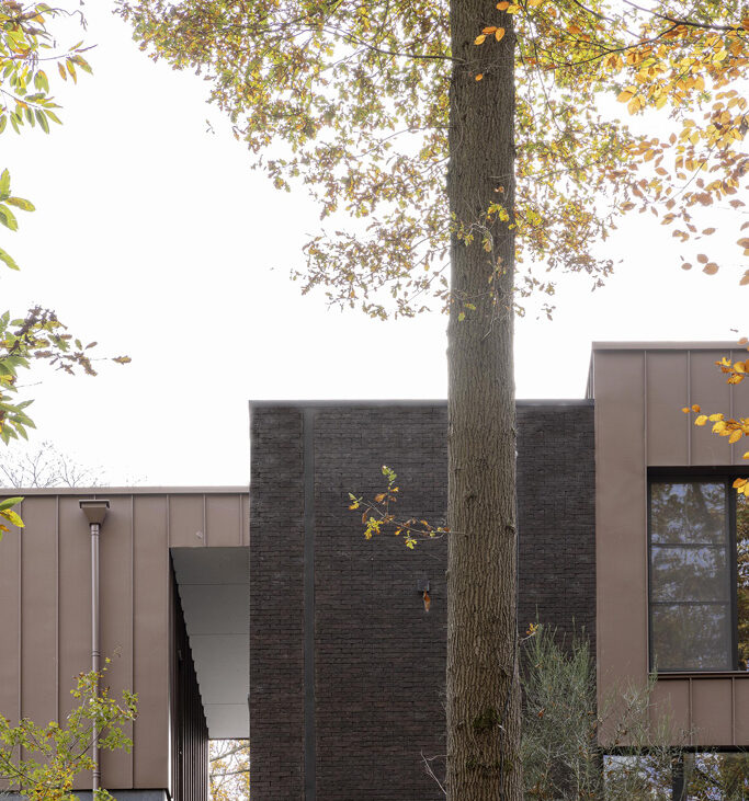 Deux matériaux de façade se répondent. La brique de ton gris foncé avec des nuances de brun est utilisée pour le socle du projet qui permet d’ancrer celui-ci sur le terrain. Le zinc teinté brun/rouge, rappelle la légèreté des feuilles automnales du lieu et vient se déposer sur le volume en briques.