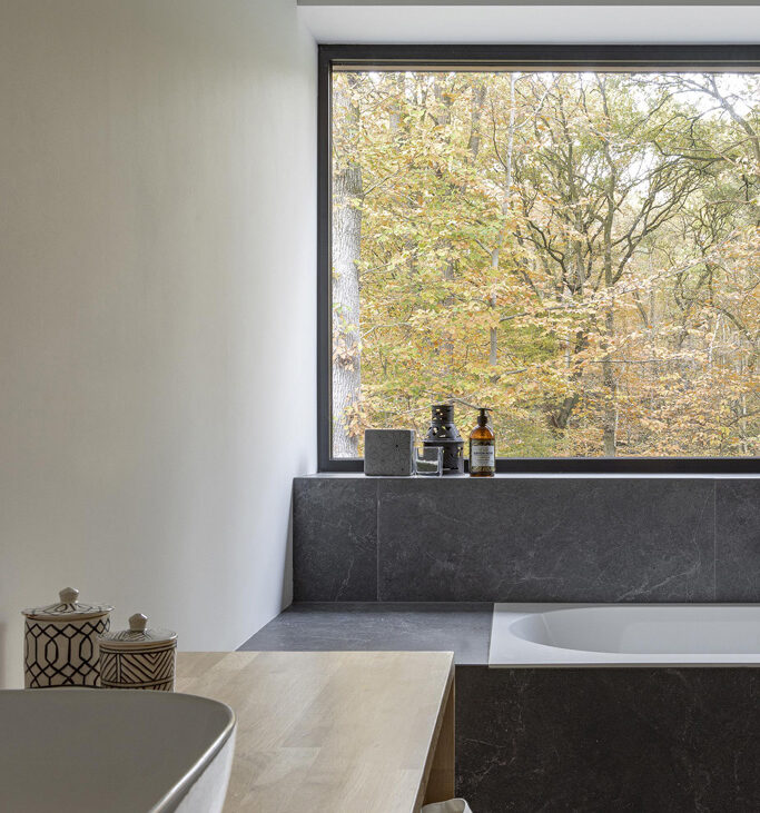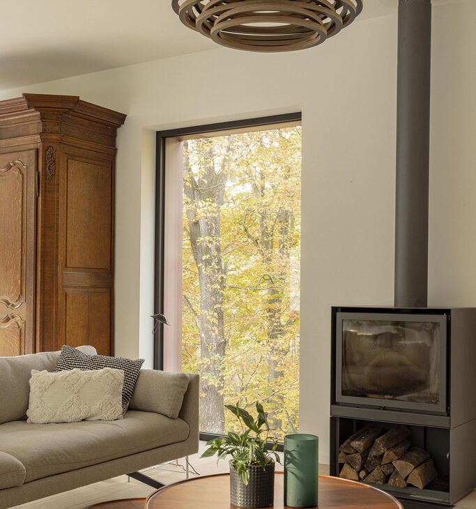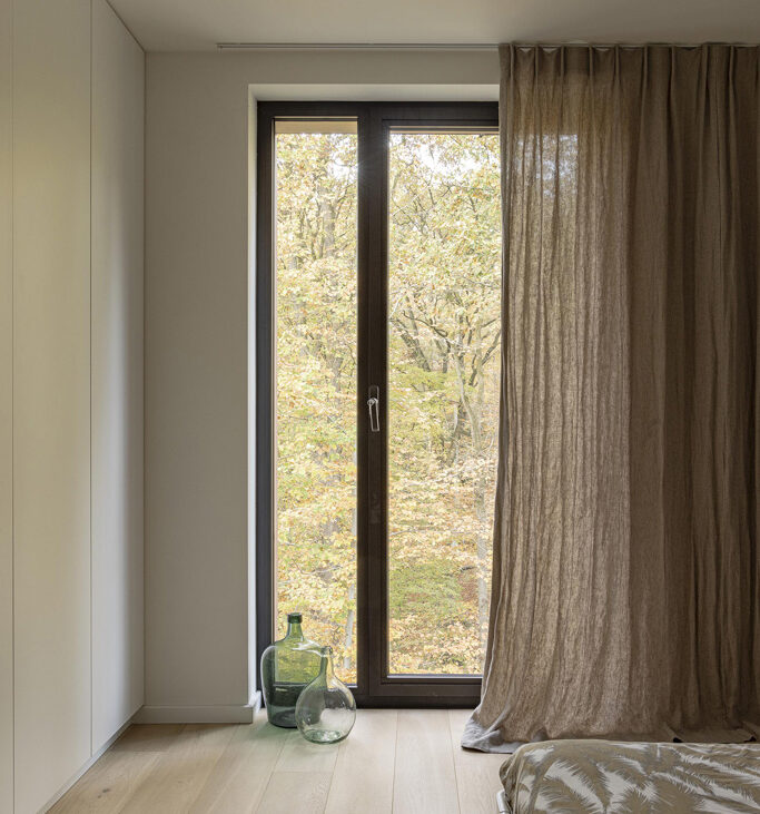 La principale ambition dans la proposition architecturale étant de s’intégrer sur un site complexe et de vivre en lien avec la verticalité des chênes et hêtres environnants.